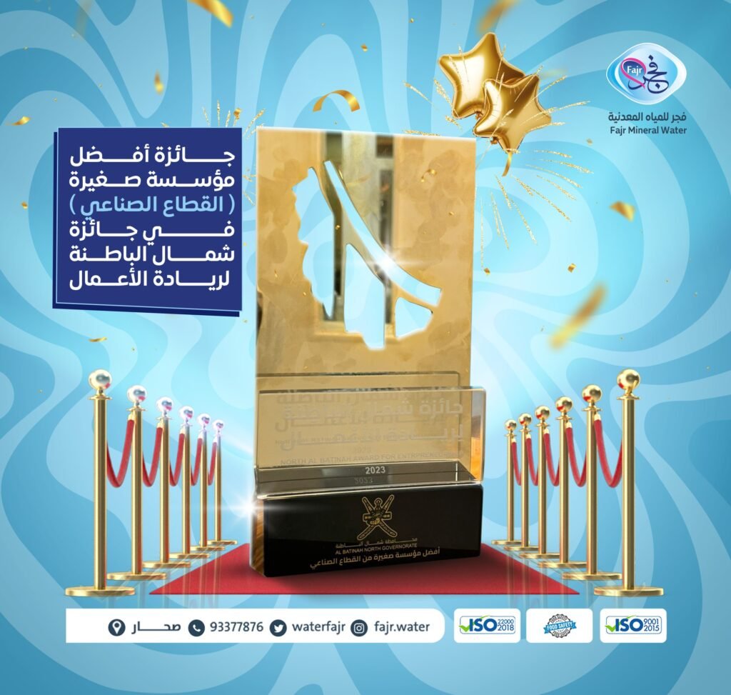 لقد تشرّفنا بالحصول على جائزة أفضل مؤسسة صغيرة في القطاع الصناعي ضمن جائزة ريادة الأعمال لمحافظة شمال الباطنة. ويعكس هذا التكريم التزامنا بتقديم منتجات عالية الجودة، وحرصنا المستمر على الابتكار في صناعة مياه الشرب المعبأة. ويُعدّ هذا الإنجاز دليلاً .على ثقة عملائنا ودعمهم المتواصل، مما يحفزنا على الاستمرار في النمو والتطور في المستقبل.